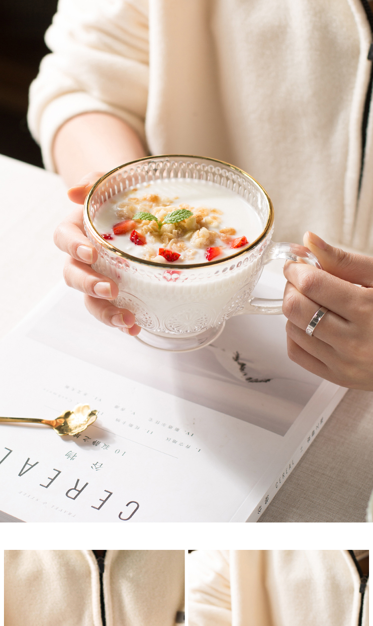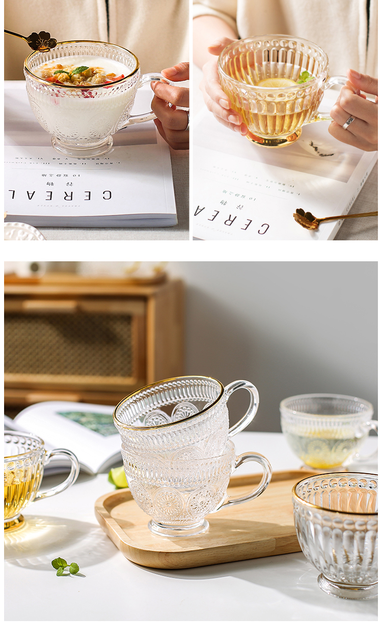 Wheatlife House Relief Golden Trim Glass Water Cup with Handle Household Transparent Breakfast Cup Milk Cup Oatmeal Cup